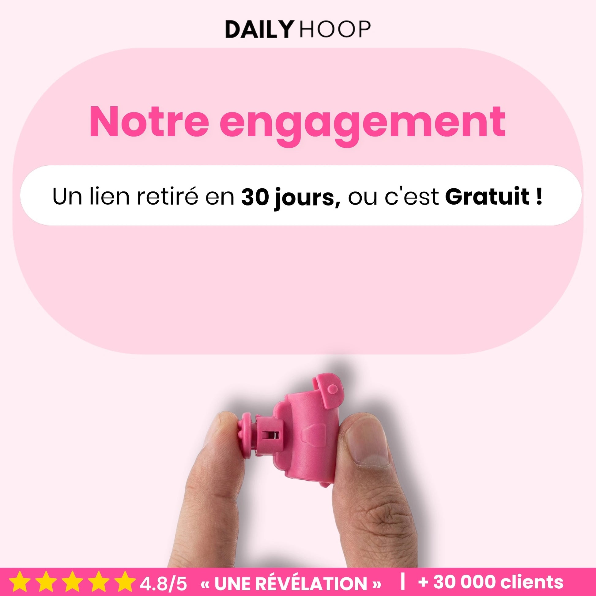 Utilisez le DailyHoop 30 minutes par jour pendant 30 jours. Si vous ne retirez pas au moins 1 lien (5 cm) de votre taille, nous vous remboursons intégralement — sans poser de questions.
